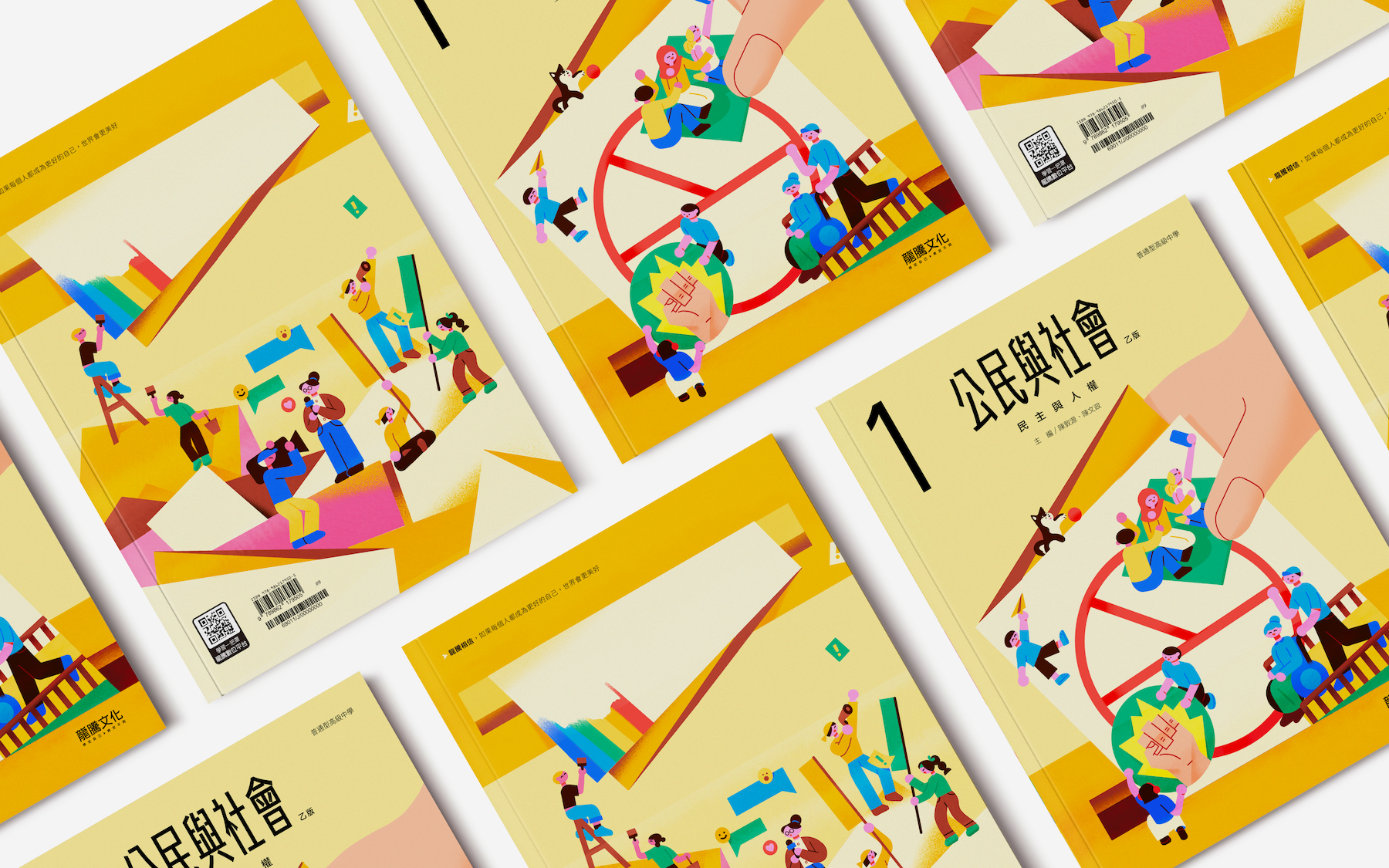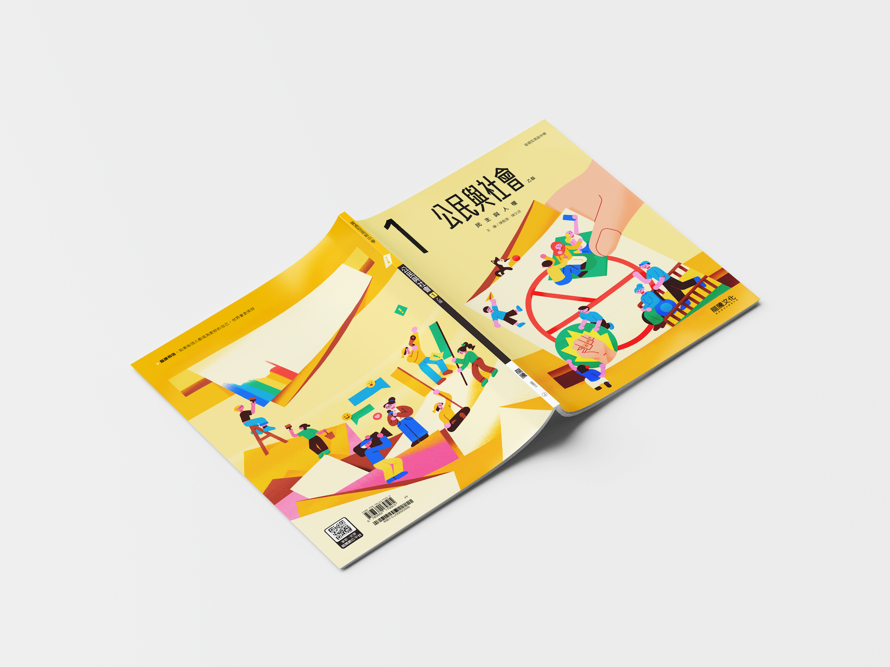 第一冊民主與人權,封面描繪巨大的手將選票投入箱中,象徵人民透過投票對社會產生影響力;封底則切換至投票箱內部視角,呈現滿載的選票及其承載的多元議題,如移工、人權、弱勢福利、媒體識讀及多元性別等,展現群眾共創社會的歷程。